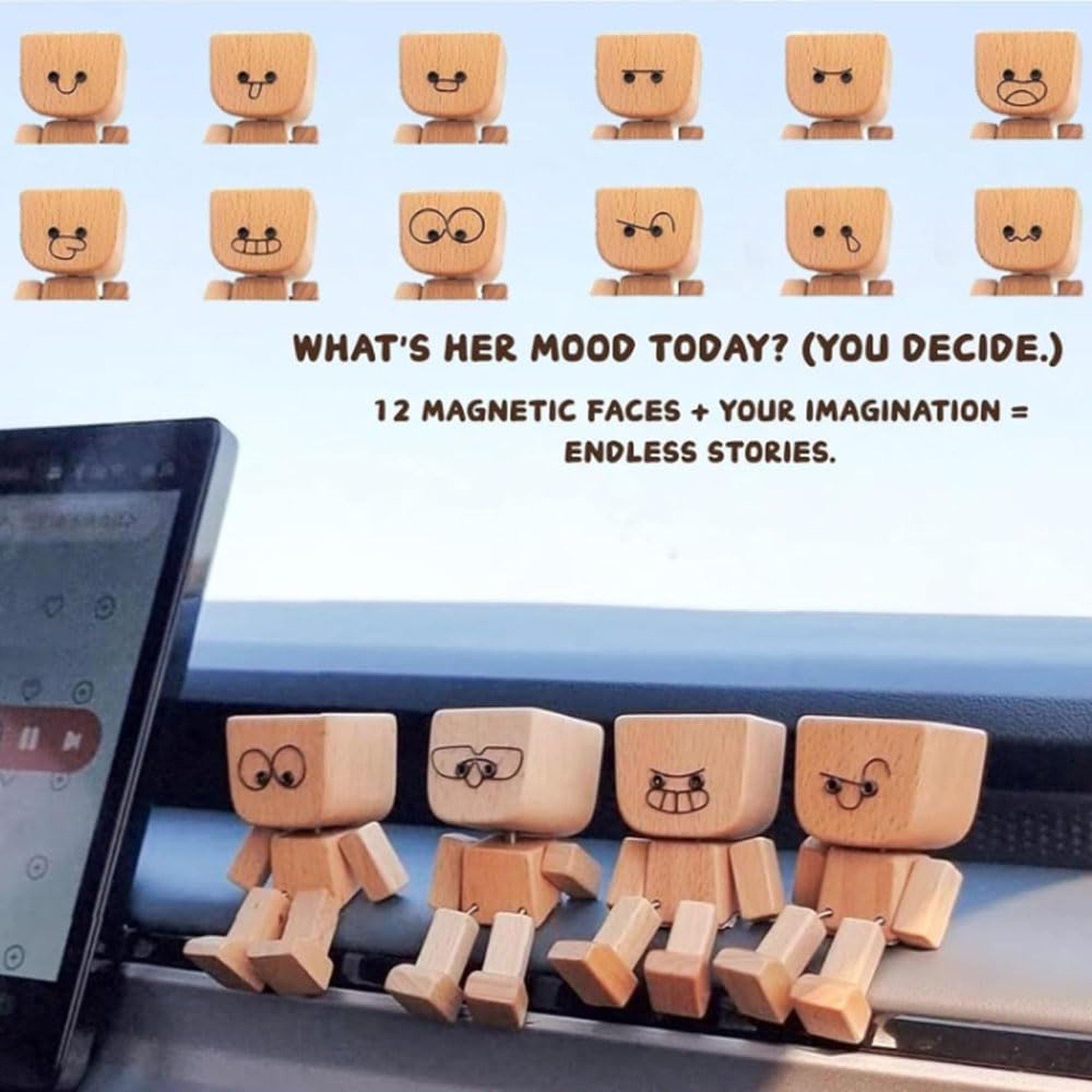 Compact & Portable: Lightweight wooden figurine travels effortlessly, instantly animating surroundings with its joyful motion—ideal as creative gifts for car enthusiasts or decor lovers